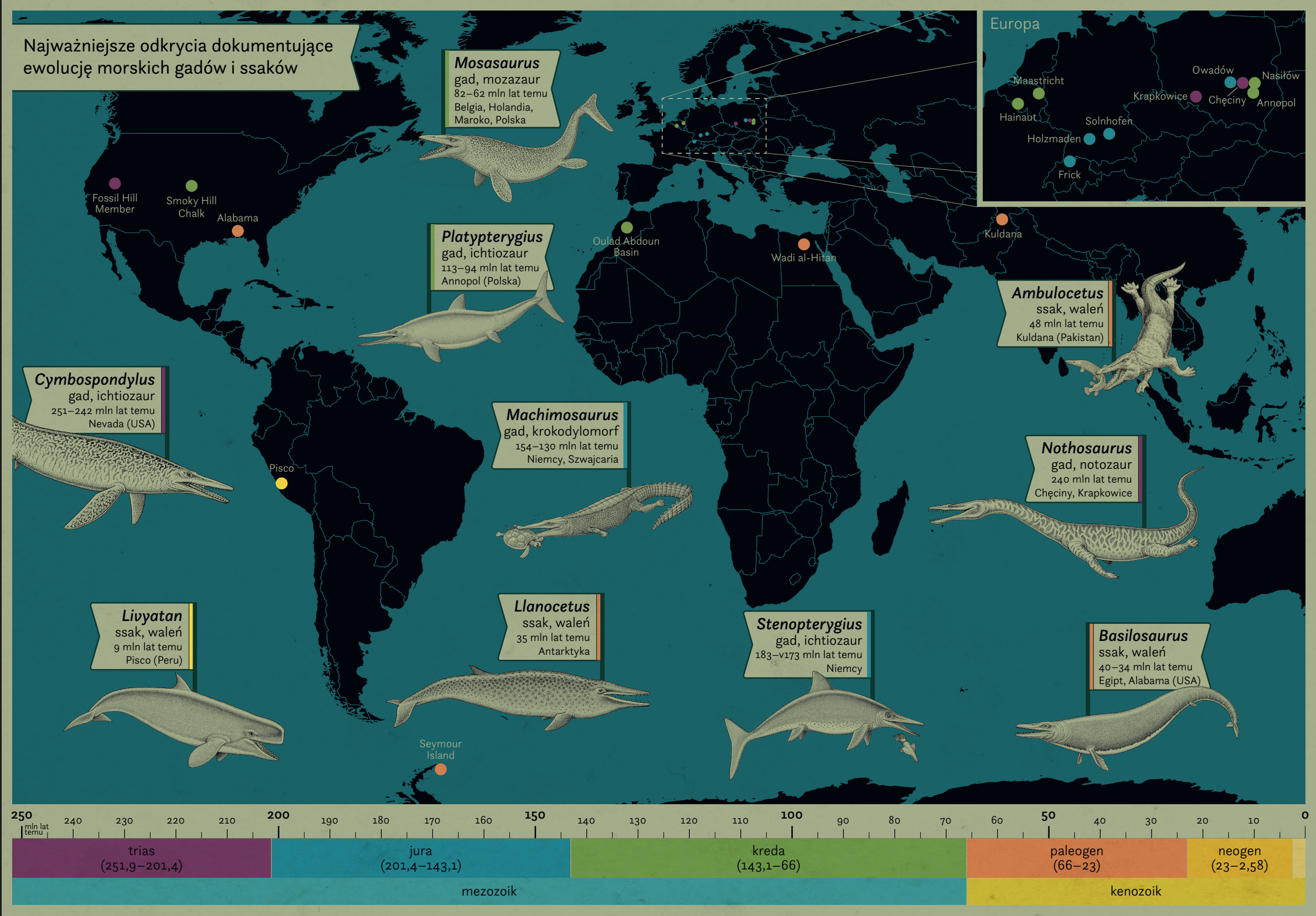 Megalodony, mozazaury, ichtiozaury – ich szczątki znajdowano na całym świecie, także w Polsce. Za fascynującymi sylwetkami dawnych władców mórz kryją się jeszcze ciekawsze pytania: jak kręgowce lądowe nauczyły się żyć pod wodą i dlaczego mimo upływu milionów lat mechanizmy ewolucji wciąż działają tak samo?