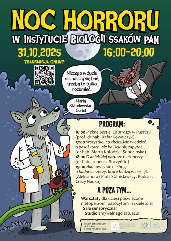 – Od lat prowadzimy w Instytucie różne akcje popularyzujące naukę i zauważyłem, że im ciekawszy pomysł wyjściowy, tym lepszy efekt końcowy. A co może być lepszego niż w Halloween, w atmosferze horroru i strachu opowiadać o tematach, które dla publiczności wydają się przerażające albo obrzydliwe? – pyta (retorycznie) dr hab. Tomasz Samojlik z Instytutu Biologii Ssaków PAN, organizator wydarzenia.