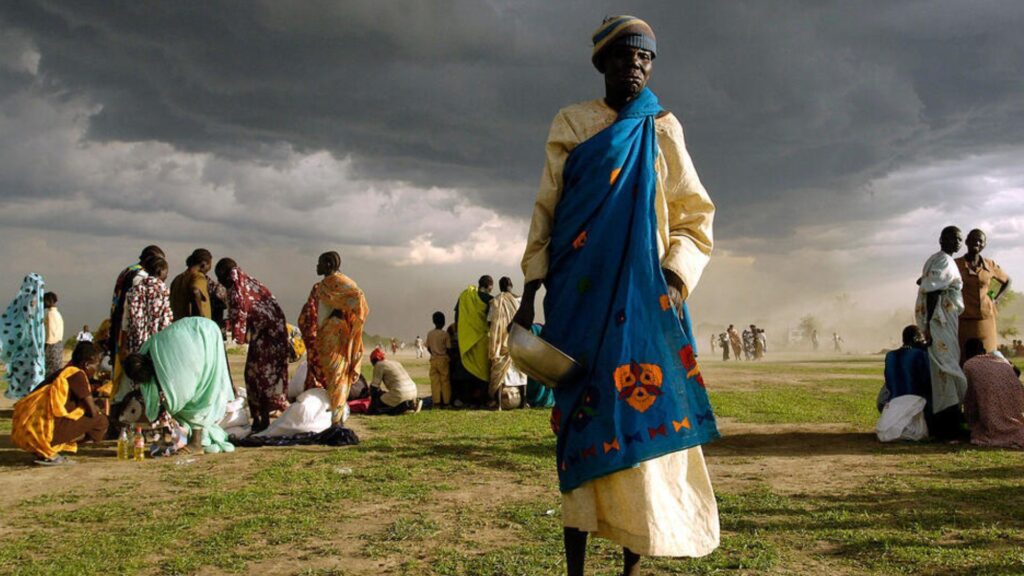 Starsza kobieta, wewnętrznie przesiedlona z Abyei w wyniku ciężkich walk, przygotowuje się do odebrania racji żywnościowej w ramach pomocy humanitarnej. Agok, Sudan, Fot. Tim McKulka / UN Photo