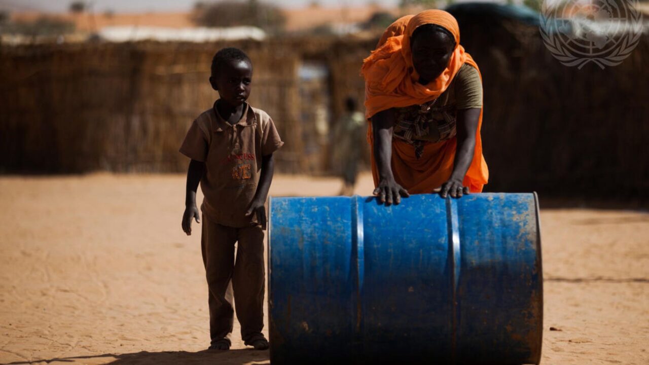 Kobieta z dzieckiem napełnia zbiornik wodą dostarczaną przez misję UNAMID w obozie dla osób wewnętrznie przesiedlonych Alabassi w Mellit, Darfur Północny. Sudan, Fot. Albert González Farran / UN Photo.