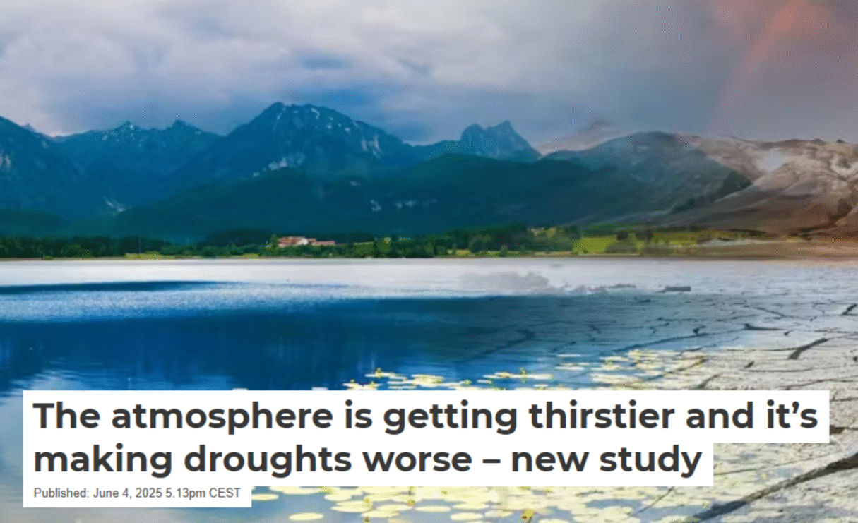 Nowe badania pokazują, że atmosfera na skutek ocieplenia pochłania coraz więcej wody. Chodzi o zjawisko określane jako atmosferyczne zapotrzebowanie na wodę, które opisuje, ile wilgoci może pochłonąć powietrze wskutek parowania wody. Tempo parowania i oddawania wilgoci przez rośliny wzrasta wraz z rosnącymi temperaturami.