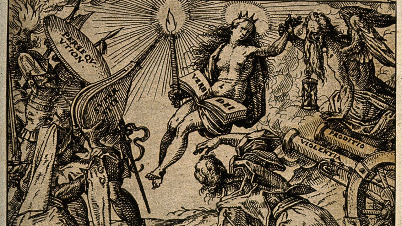 Alegoria prawdy. Rycina Christopha Murera z początku XVII wieku przedstawiająca prawdę jako kobietę osaczoną przez prześladowania, przesądy i przemoc.