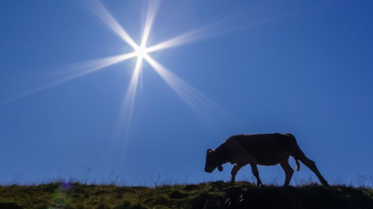Cielę pasące się w ostrym, południowym słońcu w okolicach Lech w austriackim Vorarlbergu. Fot. Friedrich Haag, CC BY-SA 4.0.