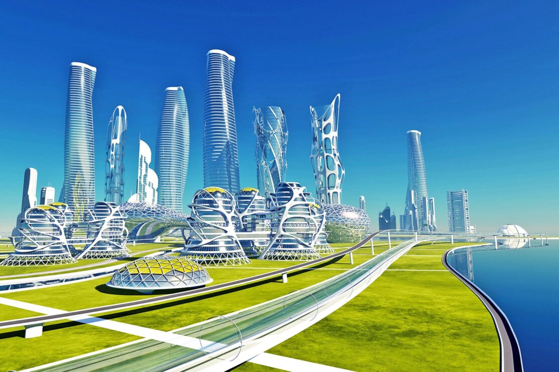 Grafika w konwencji solarpunkowej przedstawiająca symulację centrum Berlina z dużymi połaciami zieleni, czystą wodą, balonami i statkami powietrznymi. AERROSCAPE & LINO ZEDDIES, CC BY-SA 4.0, VIA WIKIMEDIA COMMONS