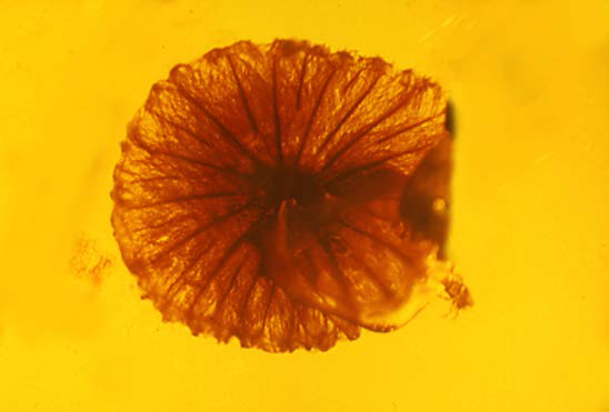 Grzyb Paleomorchella dominicana (smardz dominikański) zachowany w dominikańskim bursztynie – jedno z najstarszych znanych skamieniałości grzybów kapeluszowych.