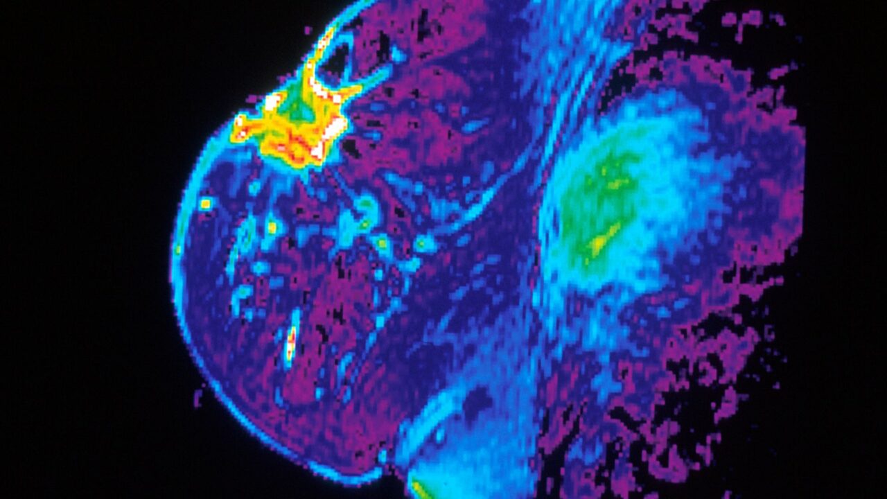 Obraz rezonansu magnetycznego (MRI) piersi z zastosowaniem wzmocnienia kolorystycznego, ukazujący szczegóły jej budowy. Źródło: National Cancer Institute (NIH), fot. dr Steven Harmes, Baylor University Medical Center, Dallas (domena publiczna).