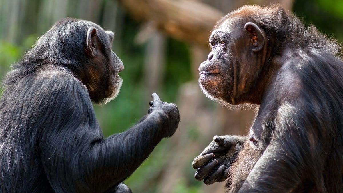 Wiele zwierząt, w tym szympansy, ma systemy komunikacji, które są zaskakująco złożone. Szympansy np. używają zarówno wokalizacji, jak i gestów do komunikacji. PATRICK ROLANDS/SHUTTERSTOCK.COM