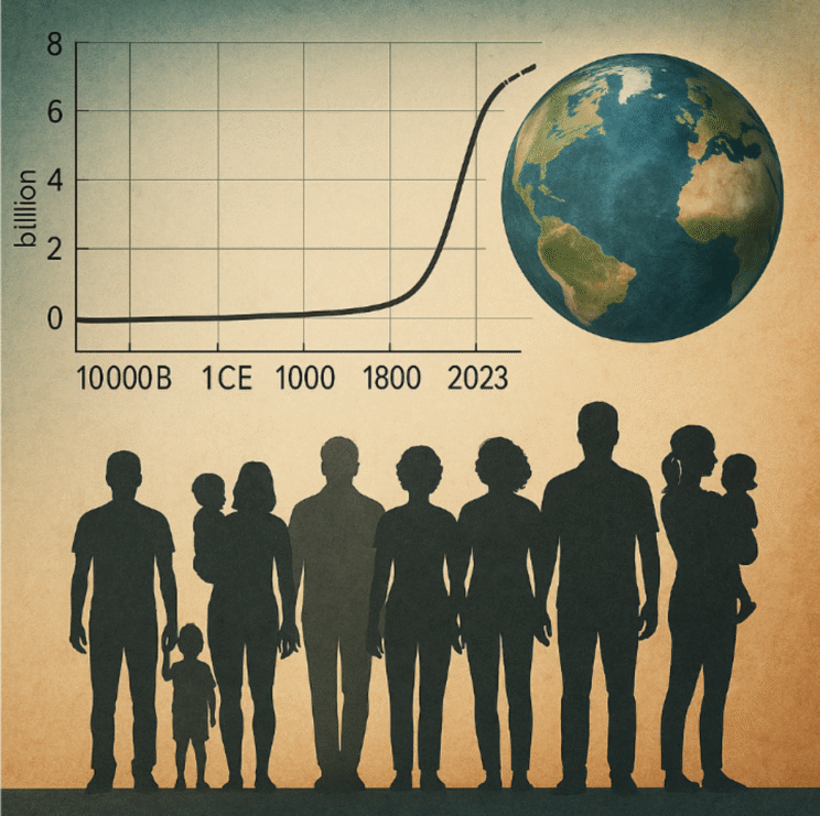 Artykuł przedstawia analizę wzrostu globalnej populacji od 10 000 roku p.n.e. do 2023 roku przy użyciu równań typu Verhulsta, uwzględniających zależność między liczbą ludności a dostępnymi zasobami. Autorzy identyfikują dwa wyraźnie odmienne okresy zmian tempa wzrostu populacji – przed i po roku 1968 – oraz wskazują, że proste modele matematyczne nie wystarczają do pełnego opisu tych zjawisk. Zamiast tego proponują podejście oparte na filtracji danych i analizie wrażliwej na zakłócenia, które ujawnia wpływ wydarzeń historycznych na tempo wzrostu populacji. Praca łączy elementy demografii, fizyki układów złożonych i nauk o środowisku, podkreślając znaczenie samoorganizacji i adaptacji w kierunku zrównoważonej cywilizacji.