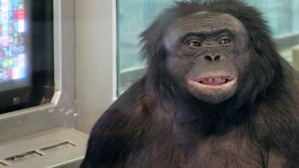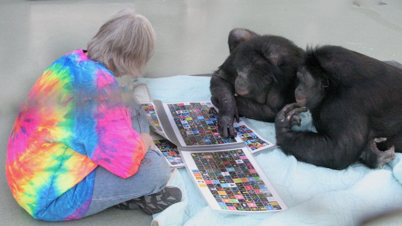 Bonobo Kanzi i jego siostra Panbanisha podczas pracy z przenośną klawiaturą leksygramów, w towarzystwie badaczki Sue Savage-Rumbaugh. Zdjęcie dokumentuje eksperymenty nad komunikacją i rozumieniem języka u bonobo.