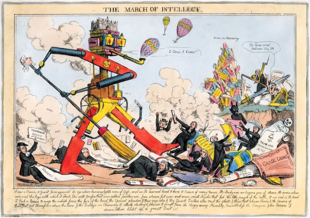 Choć powyższy przykład może brzmieć cokolwiek niewspółcześnie, a Ricardo zapewne nie słyszał o marketingu czy generowaniu popytu, to w jego słowach dają się wyraźnie dostrzec obawy przed automatyzacją (nawet jeśli nie używano wtedy tego słowa) czy po prostu przed byciem zastąpionym przez maszyny albo zostaniem „człowiekiem zbędnym”. Rewolucja przemysłowa przyniosła też wiele zmian w ówczesnym społeczeństwie brytyjskim, np. stawiano większy nacisk na upowszechnienie wiedzy naukowej, zwłaszcza z nauk przyrodniczych – zjawisko to, nazwane Marszem Intelektu, stanowiło zarazem przedmiot gorących dyskusji. Klimat i wyobraźnię tamtych czasów dobrze oddaje rysunek Roberta Seymoura z 1828 roku przedstawiający coś na wzór humanoidalnego robota na parę wymiatającego wielką miotłą wszelkiej maści zapóźnione ustawy parlamentarne, sprawy sądowe czy też szarlatanów.