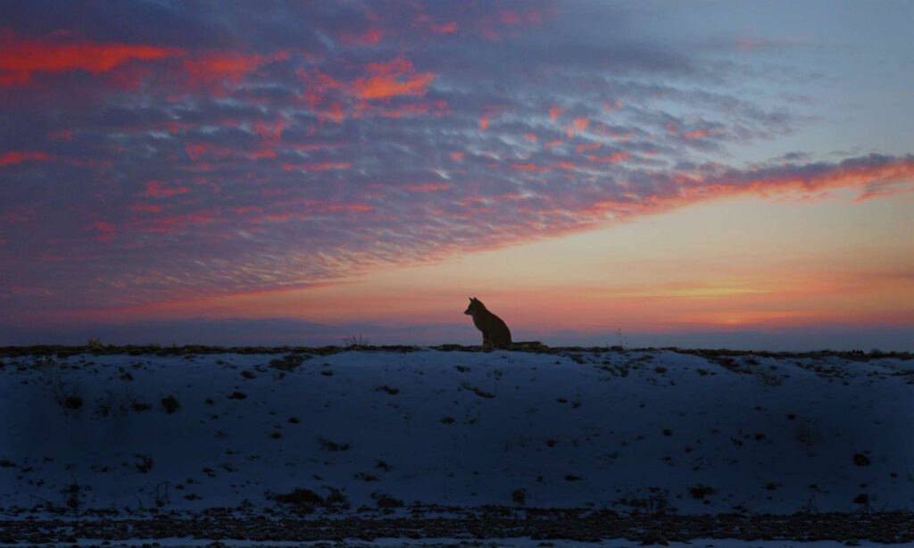 Zachód słońca w rezerwacie Lille Vildmose w Danii; na horyzoncie widoczny kontur wilka.