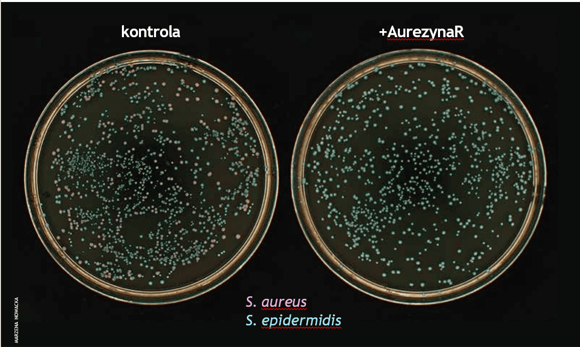 Nasz zespół już od lat pracuje nad enzybiotykmi, które selektywnie eliminują bakterie patogenne. Wśród nich są także enzybiotyki przeciwko gronkowcowi złocistemu, które jednocześnie są bezpieczne dla bakterii budujących naturalną mikroflorę skóry. Opatentowana przez nas AurezynaR* usuwa S. aureus i jest zupełnie nieszkodliwa dla komensalnych bakterii, takich jak S. epidermidis. Co więcej, enzybiotyk ten jest konkurencyjny w stosunku do Staphefektu dzięki swojej wyjątkowej efektywności i szybkości działania. Dlatego kontynuujemy badania nad wykazaniem skuteczności AurezynyR na pacjentach z atopowym zapaleniem skóry, łuszczycą, liszajcem oraz innymi schorzeniami z nadzieją, że nasz enzybiotyk wkrótce przyniesie ulgę pacjentom.