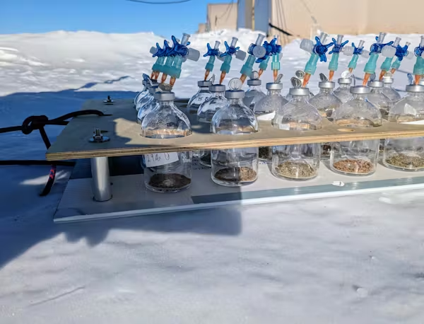Próbki gleby inkubowano w szklanych fiolkach na Antarktydzie, aby wykazać, że mikroorganizmy zużywają gazy atmosferyczne w naturalnych warunkach środowiskowych. Fot. Ry Holland.