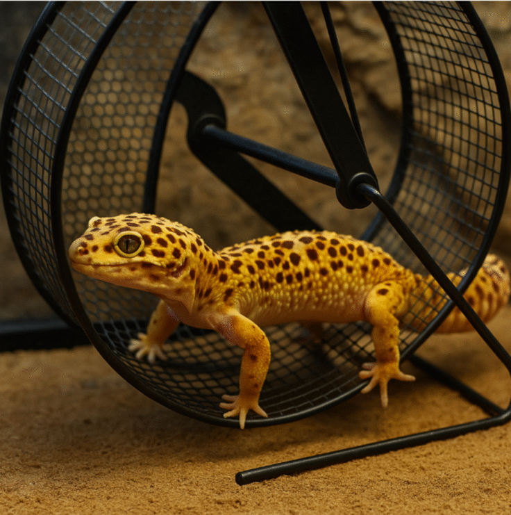 Popularny gad domowy, gekon lamparci spontanicznie korzysta z kołowrotka