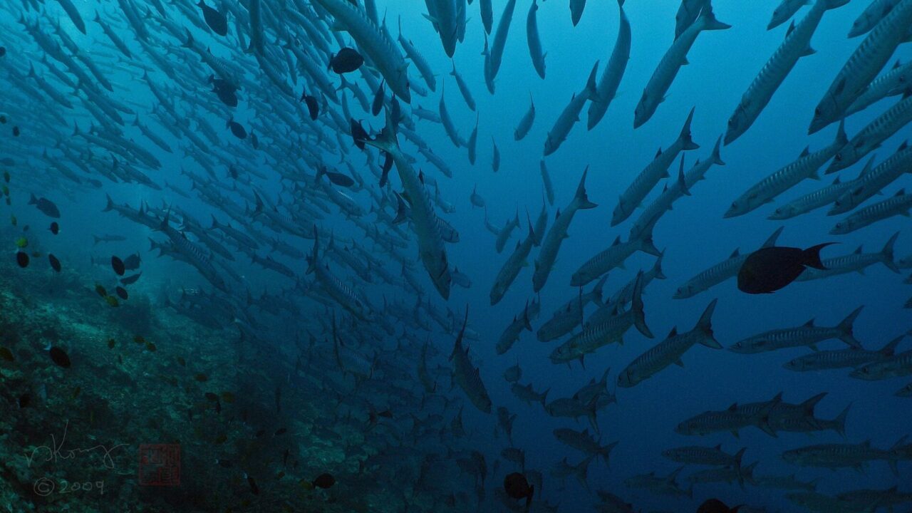 Ławica barrakud krążących nad rafą koralową.