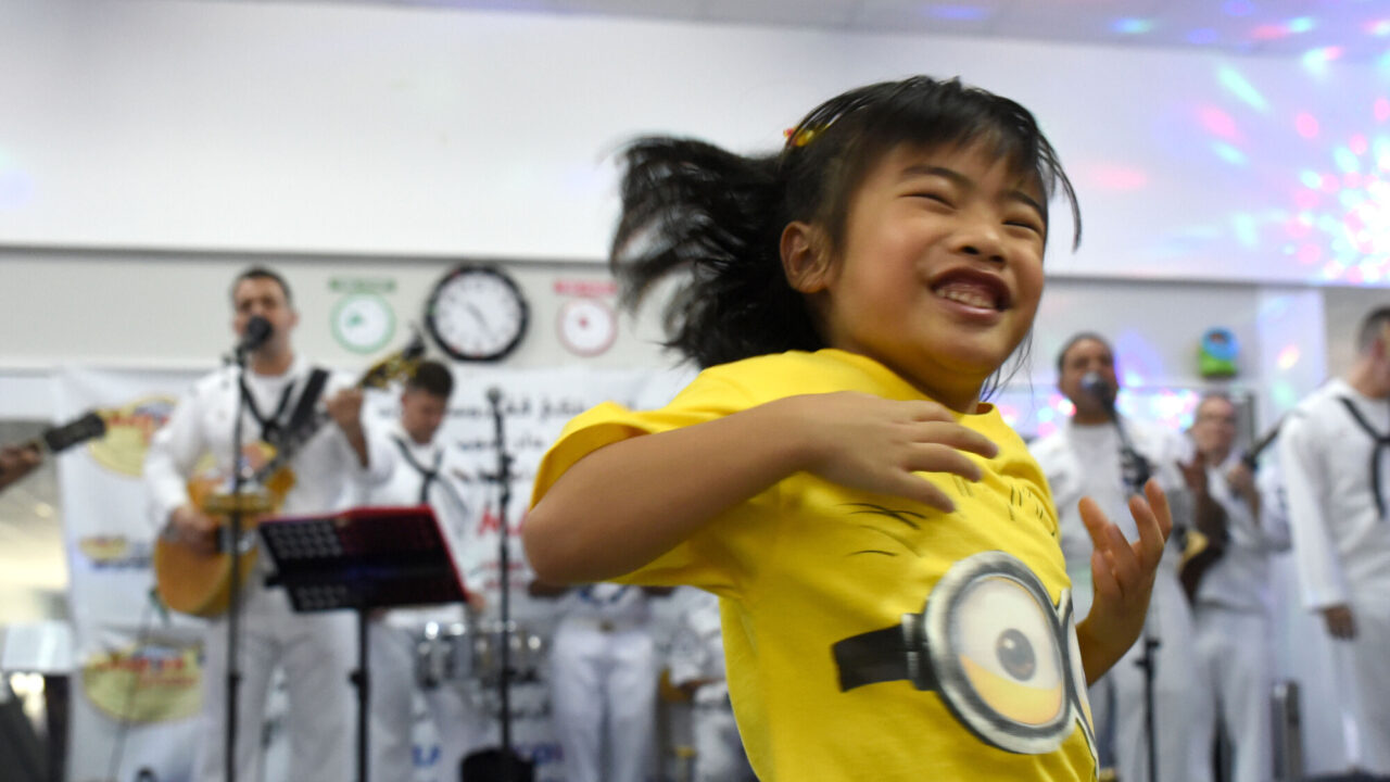 Uczenica z ośrodka SMARTER Brunei, zajmującego się wspieraniem osób w spektrum autyzmu, tańczy podczas występu z udziałem zespołu muzycznego U.S. 7th Fleet Band