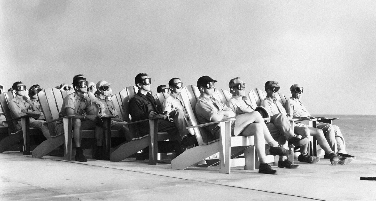 Krzesła ustawione na platformie obserwacyjnej podczas testu jądrowego George w ramach programu Operation Greenhouse na atolu Enewetak w 1951 r.