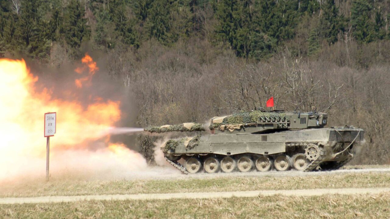 Czołg Leopard 2A4 podczas strzelania na poligonie Allentsteig w Austrii.