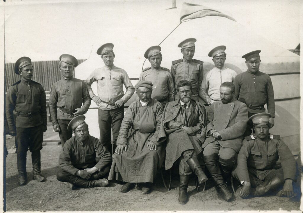 Fot. 3 Uczestnicy wyprawy naukowej do Mongolii latem na tle jurty. W środku od lewej siedzą: Cyben Żamcarano, Władysław Kotwicz, Konstanty Maskow, towarzyszy im kozacka eskorta