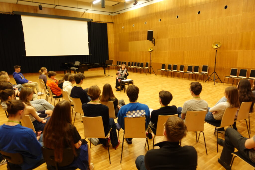 Różnorodność doświadczeń jest bardzo ważna. Będąc młodym naukowcem, warto posłuchać o czymś niezwiązanym z dziedziną własnych zainteresowań, a nuż będzie to nieoczekiwanym źródłem inspiracji i odkryć? Grupa stypendystów poznawczych, humaniści i plastycy, złapani w kadrze podczas spotkania z prof. Krystyną Borucińską opowiadającą o muzyce